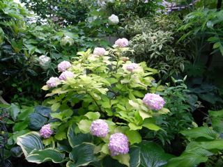 暗い北の庭でも、オウゴンバ・アジサイを植えたところは、