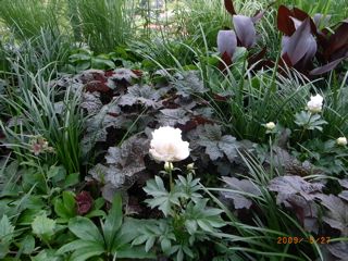 ボタニカのプランター、ダークカラーのゾーンに白いシャクヤク。