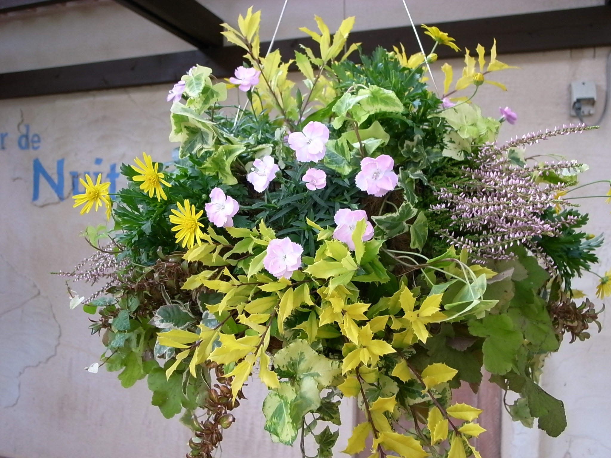 植え付けたばかりのハンギングは沼尻將惠さんの作品。