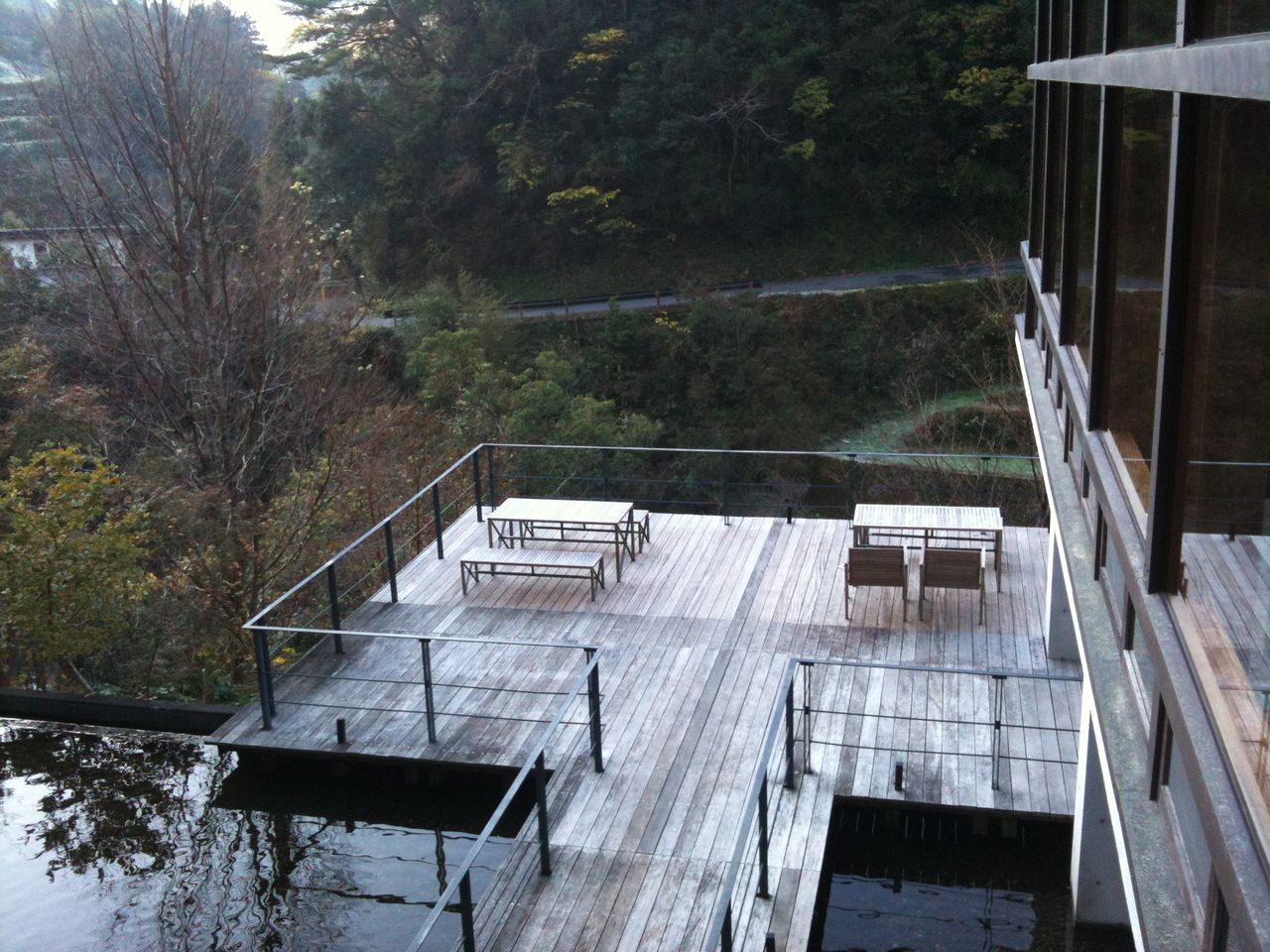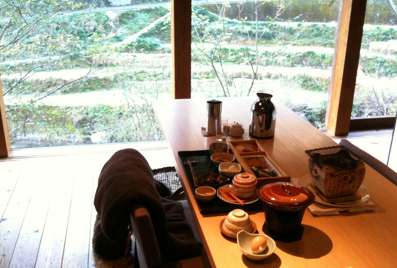朝、景色を見るとあたりは真っ白。お食事の美味しい憧れの宿だったのですが、暖房が効かずガタガタ震えて過ごした一晩。朝方から悪寒が走ってまさかの風邪引き。きっと疲れていたので、風邪にはそこをつけ込まれたのでしょう。そうなる前に講じるべきことをしなかった自分が悪い。例えば夜中でもフロントに電話して対策を頼むとか、言うべきクレームやお願いはするべきだったと反省。おいしいはずの朝食もあまり食べられず残念。...窓の外の白は霜です。