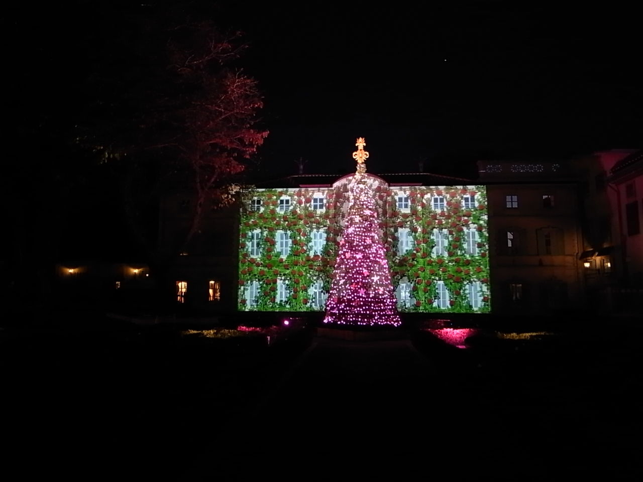 点灯夫がクリスマスツリーに灯りを灯すとふわ〜っと下からクリスマスツリーに光が。