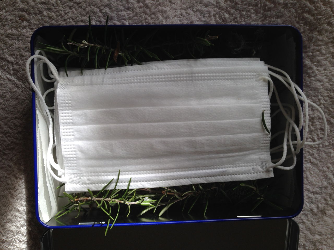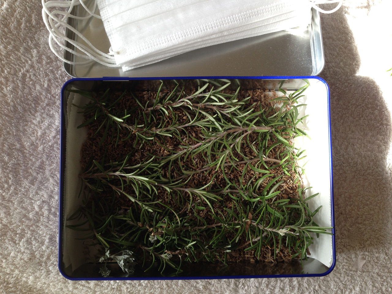 去年の夏に、バッキンガム宮殿で開催されたイギリス製品マーケットでこのシード缶を購入。中身は空で売っていました。そこで、ここにマスクのストックをキープ。サイズが丁度よかったので。