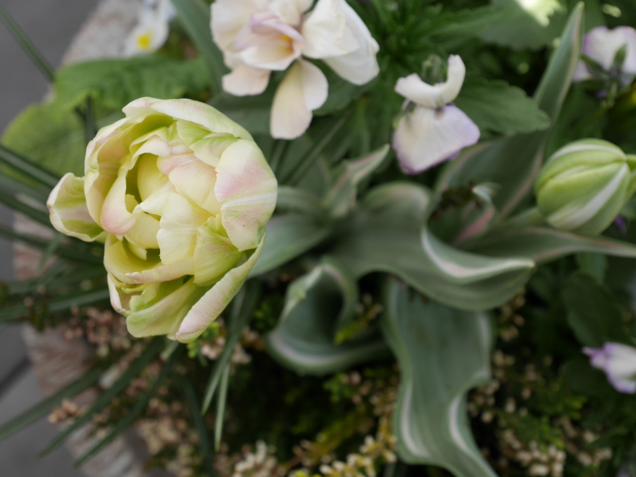去年の11月に、私のお店に飾ったスキミアの寄せ植え。球根がだいたい咲きそろいました。が、スイセン’ハウエラ’の葉が暴れて、う〜ん、切ってしまいたい。そう思うんですが、来年も開花させたいので、このままにしておくか。悩み中です。