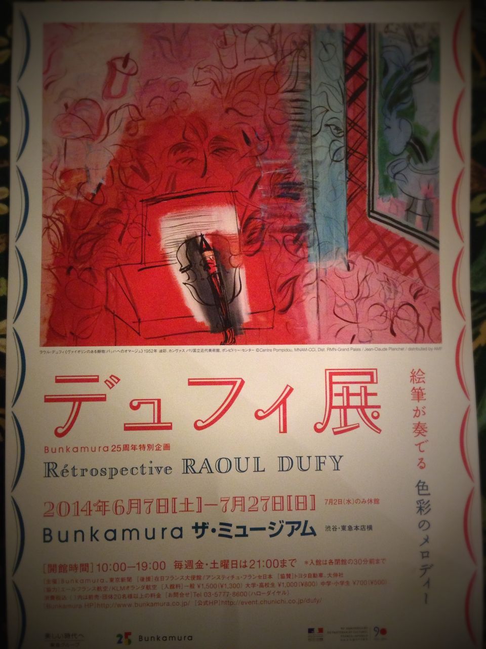 さて!数日中に東京新聞にレビューを書く関係で浜松から渋谷に直行。今日は、渋谷文化村で明日から開催される「デュフィ展」のレセプション。もう!最高です。デュフィの絵がこれほどまでに集合するのは素晴しい!!!もの凄いお勧めです。色彩の勉強にも、打ってつけです!!!