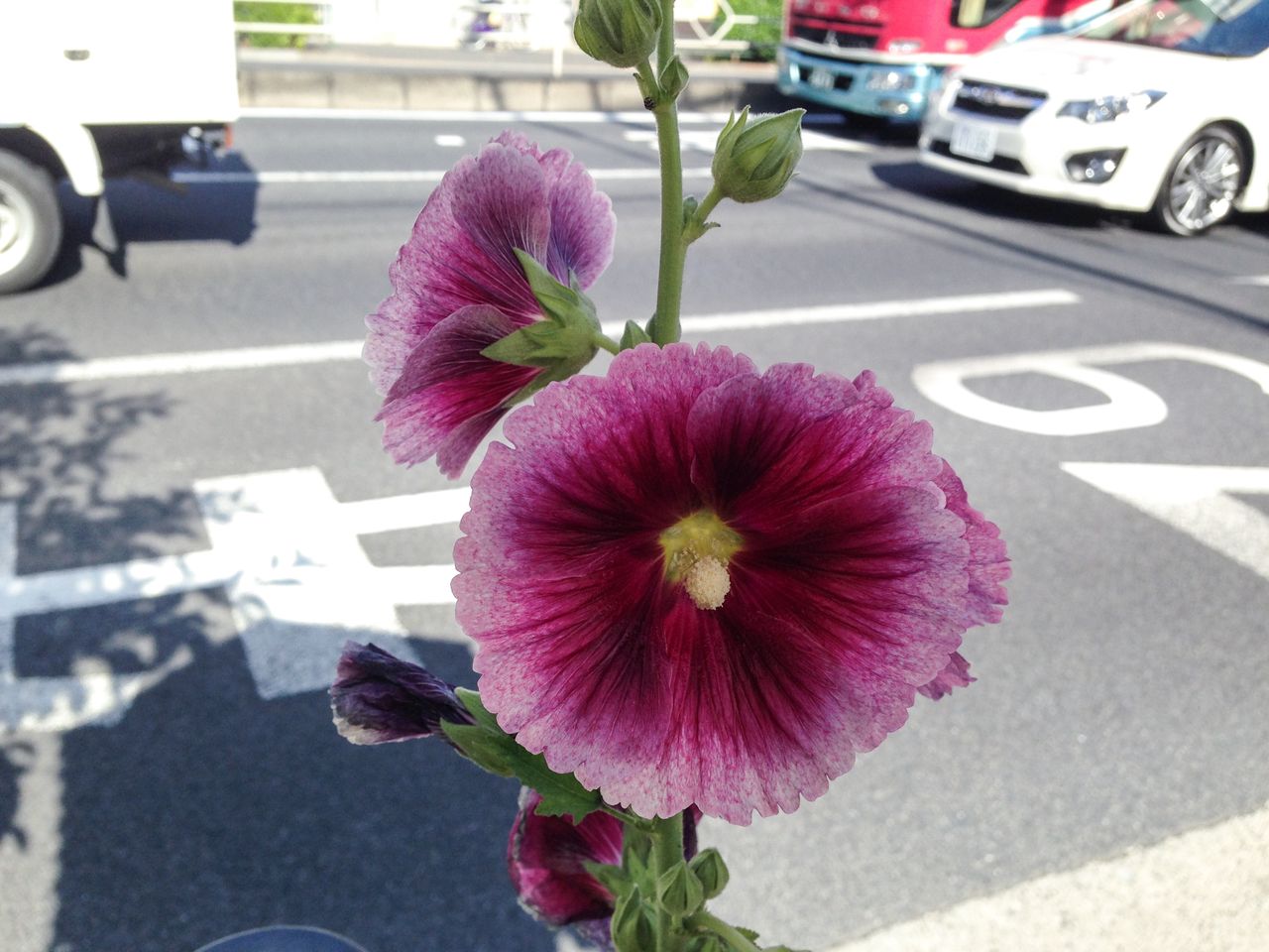 また、同じく、実家近くの国道沿いの路側帯の隙間から素敵な色のホリホックが咲いていました。排ガスも凄そうですが、日当たりと風通しはよさそうで。放置でホリホックが毎年咲く場所が、ちょっと羨ましいのです。私の庭では、どうも、この子が居座ってくれません。