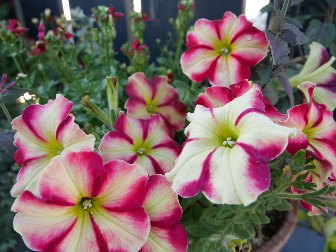 日差しが強いほど、美しい発色をする5つ星シリーズのペチュニア。チャチーンチェリー。本日、猛暑のなか麗しく咲いています。