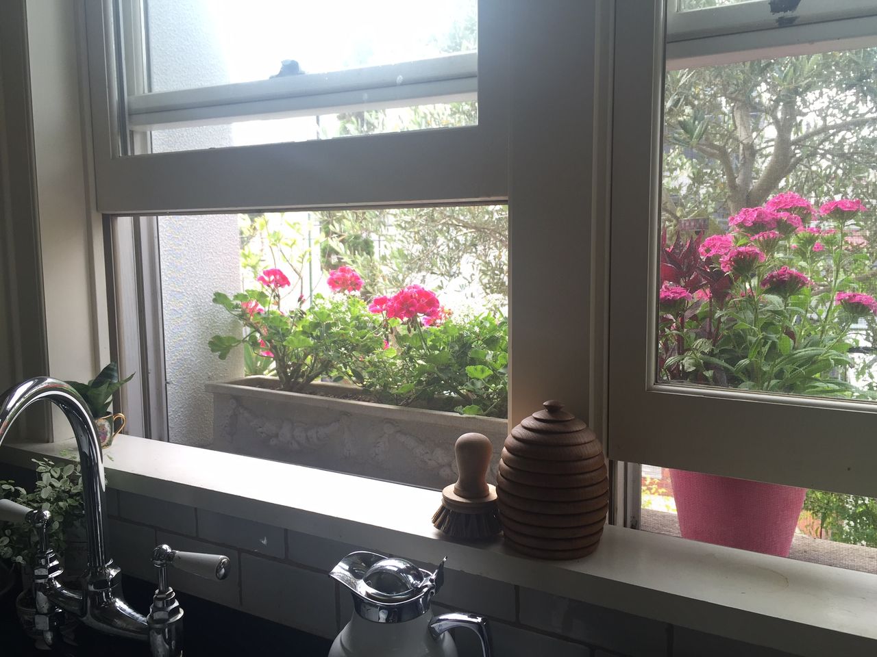 最後は国バラで使ったゼラニウム、最終日に、葉は黄変、花ゼロ、もう廃棄?の風情だった子が復活!の図。雨にあたりにくい軒下で。ゼラニウムは、東京あたりですと、秋から冬にかけてよく咲き、暖かな軒下で条件がよいと春〜初夏までずっと花が咲くので、素性のよい株を手に入れたら愛培。
