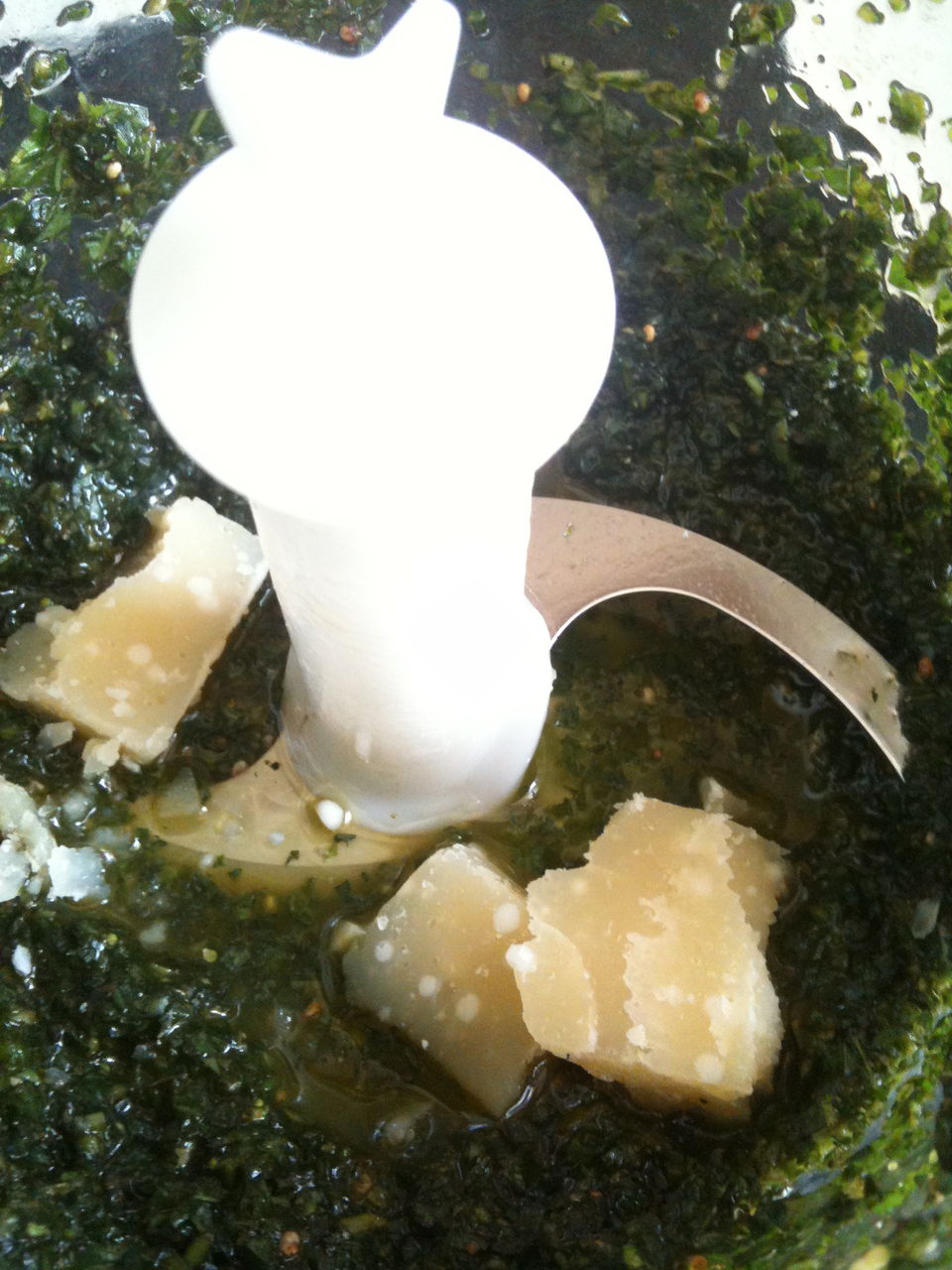 3、オイルとチーズを入れます。写真はチーズを入れ忘れてブレンダーをまわしちゃったので後から加えた。もう一度、ガガガーッ。