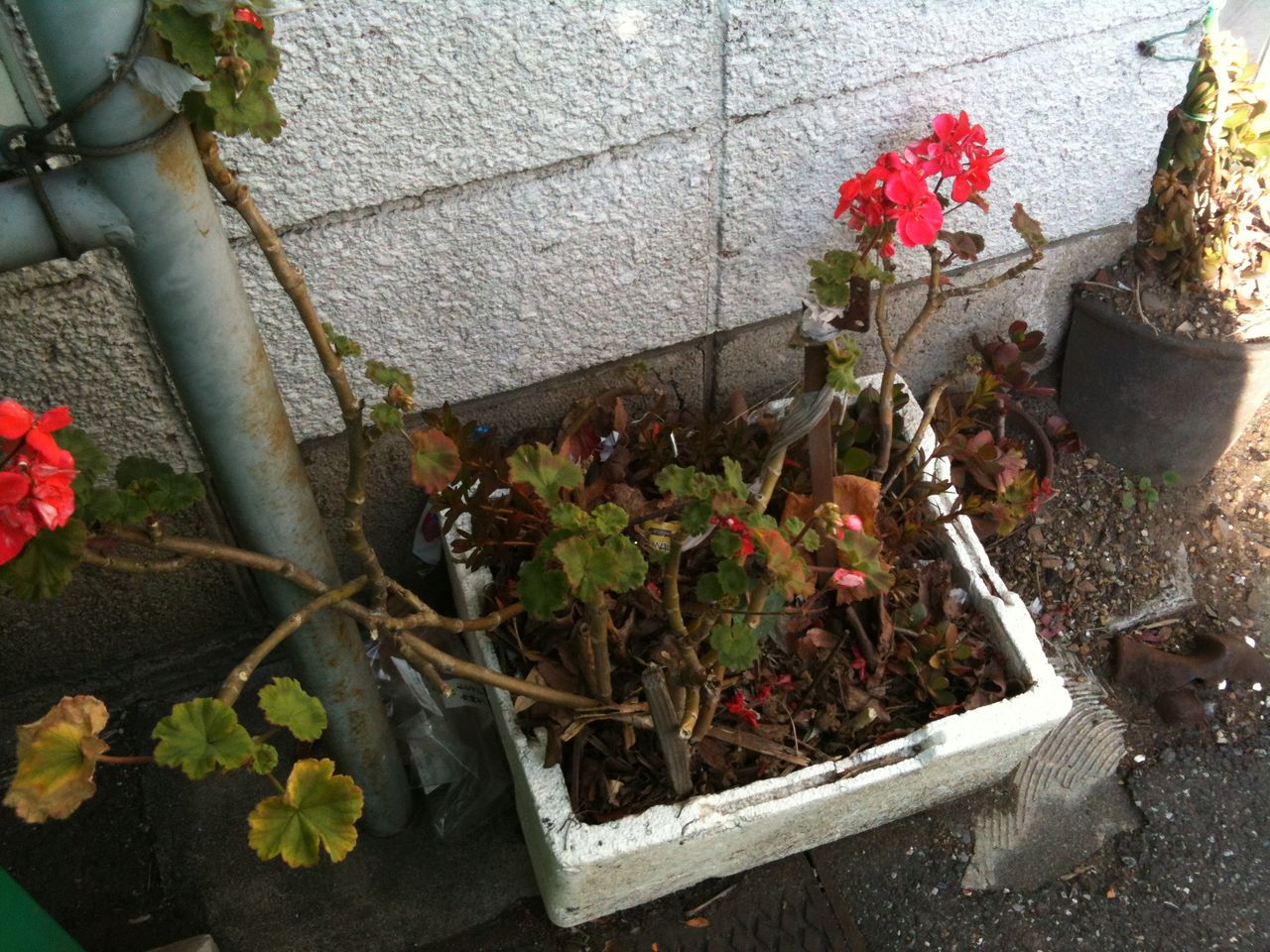 なぜ、いつも、このことにこだわるかというと。相変わらず、我が家の近所にはこんな寄せ植え(?)が少なくなりません。植物を楽しんでいるのか虐待しているのか、何も考えていないだけなのか。ゼラニウムは簡単に枯れないので、こうなってしまう。生きているからかわいそう。ということでしょうか。