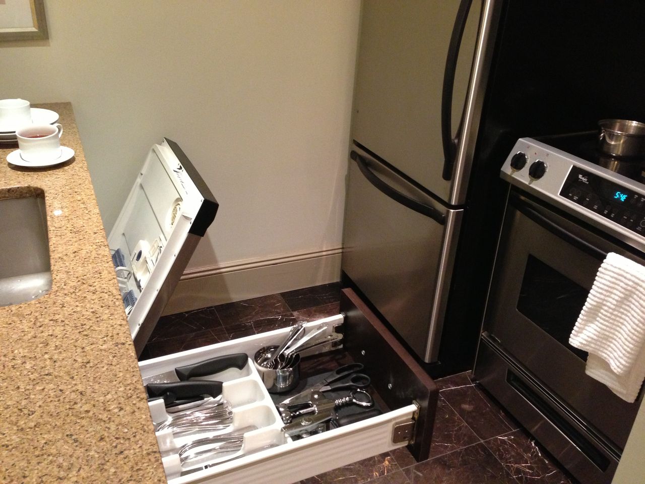 (食器洗い機、専用の洗剤やキッチン用具は一式揃い。でも、食器を洗わずにキッチンシンクに置いておくと、帰宅後には、全部洗ってしまっておいてくれる)