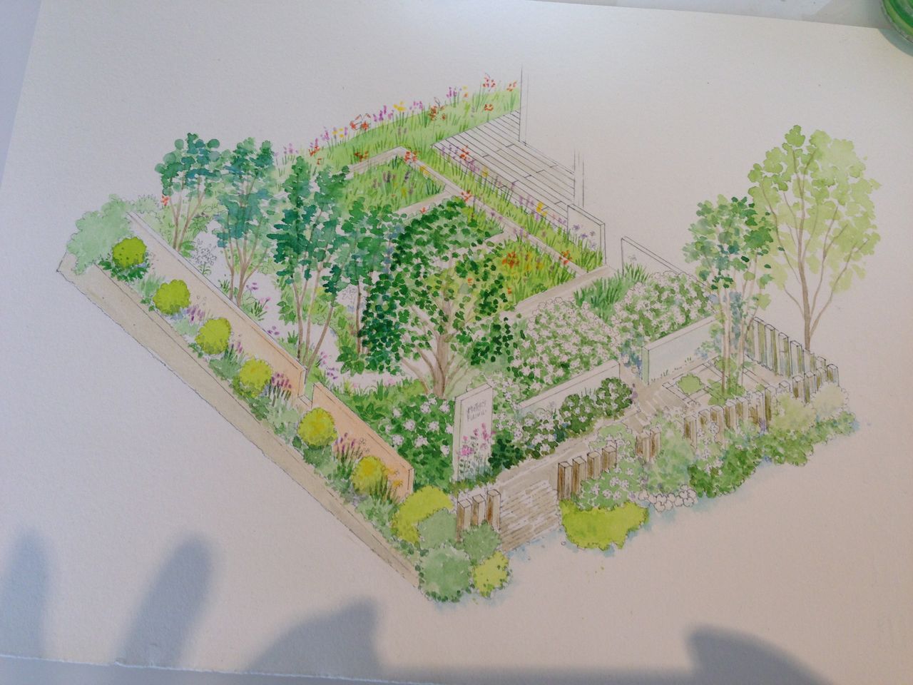 (そういえば、手前の部分にあれとこれを植えたっけ。思い出して描き加える。一度描いてしまった水彩画の上に、白っぽい花を加えるときは、透明水彩の上に不透明水彩ガッシュの白を載せて行く。なので、薄くしたい部分と濃くしたい部分最後の仕上げは、ガッシュのパーマネントホワイトが大活躍します)