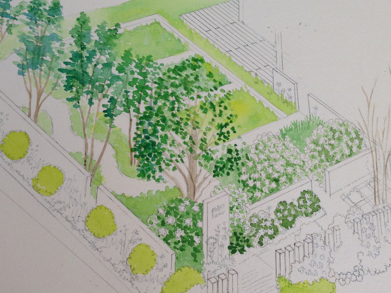 庭の完成図って、庭のできる前ですと、理想の樹形とか、こんな樹木や植物を使いたいと、希望(心に思い描いたもの)を描いて、あとからそれに近い植物を探していくというプロセスなのですが、今回は、樹木や植栽が先にありきで、植栽作業はすでに、去年の秋に完了。去年の夏に選んだ実際にある樹木の、葉のあったときを思い出しながら(あれ?でもあまり覚えていない)その感じを絵に再現するというのは初めてのことで、これが難しい!難しかった!