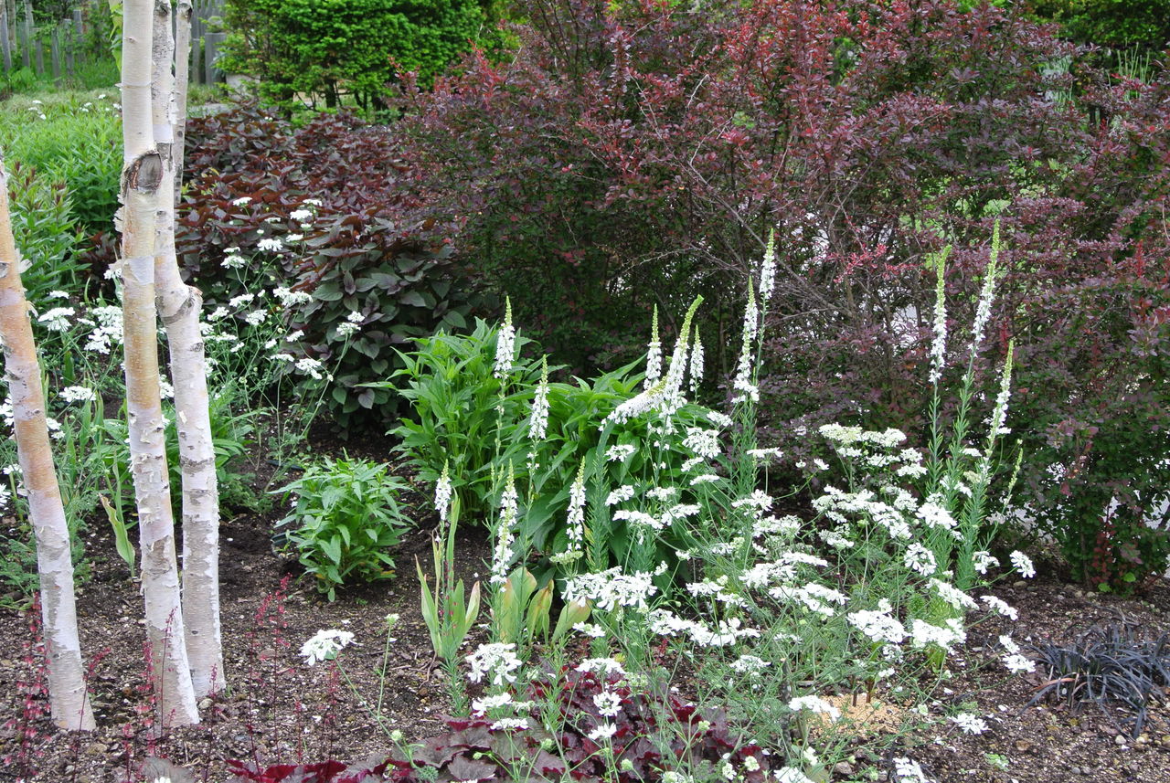 銅葉のメギを背景にして、オルラヤとリナリアのフォルム違いの白い花が素敵だ。