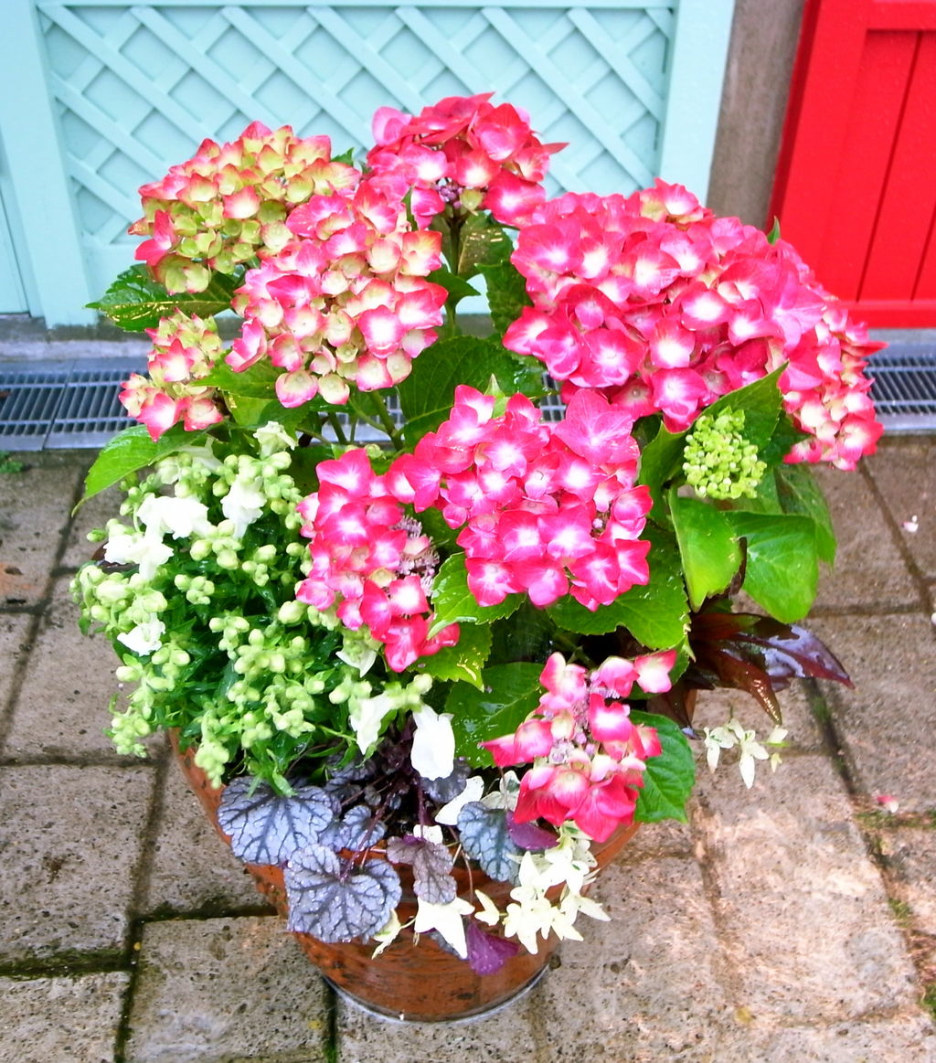 こちらは、数年前にRHSJのコンテナマスターさんたちに作って頂いた寄せ植え。実は、この寄せ植え。植え替えしないで、ずっとあります。来週。行ったら写真を撮ってこようと思います。(この寄せ植えは、作ったばかりのもの)アジサイは、雨に濡れても本当に絵になる植物ですね。