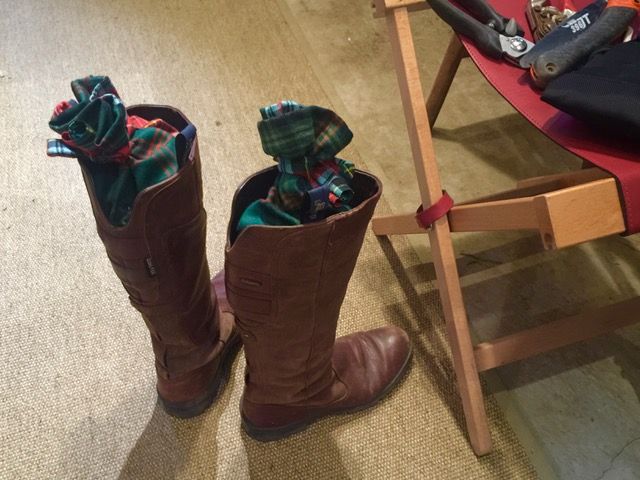 でも、脱いだあとに、ぐにゃっと倒れてしまうブーツにはブーツキーパーが必要です。いろいろ市販されていますが、私は自分で手作りしたブーツキーパーを使っています。自立してくれるブーツは、まあ、そのままでも良いのですがね。でも湿気取りに使うのもありです。