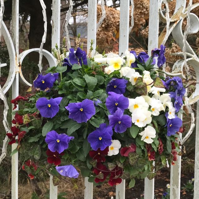 ハンギングバスケット(沼尻さん作)もきれいに繁茂しています。常に、フランス国旗の色に合わせて常に三色を選んでもらいます。
