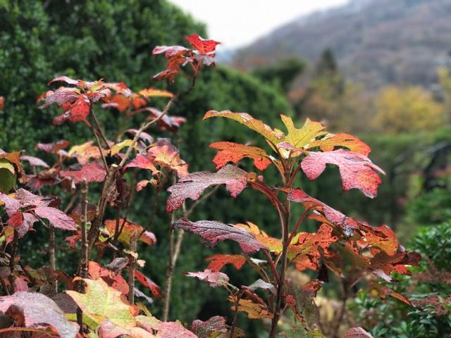箱根の山も紅葉、カシワバアジサイも同じように紅葉。ああ、ここに夕日や朝日が当たれば、綺麗だったでしょうね。
