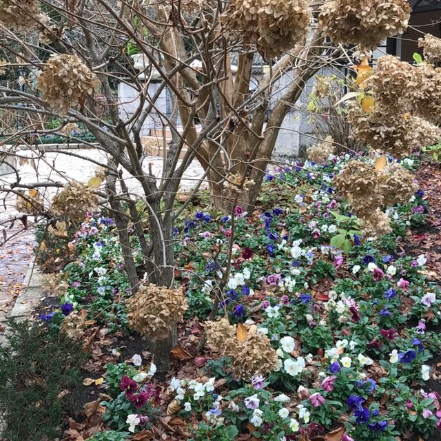 グラウンドカバーのパンジーも赤、白、青の三色の同系統に統一。これまた、夕日が射したらもっと美しく見えるのですが、暗いですね。