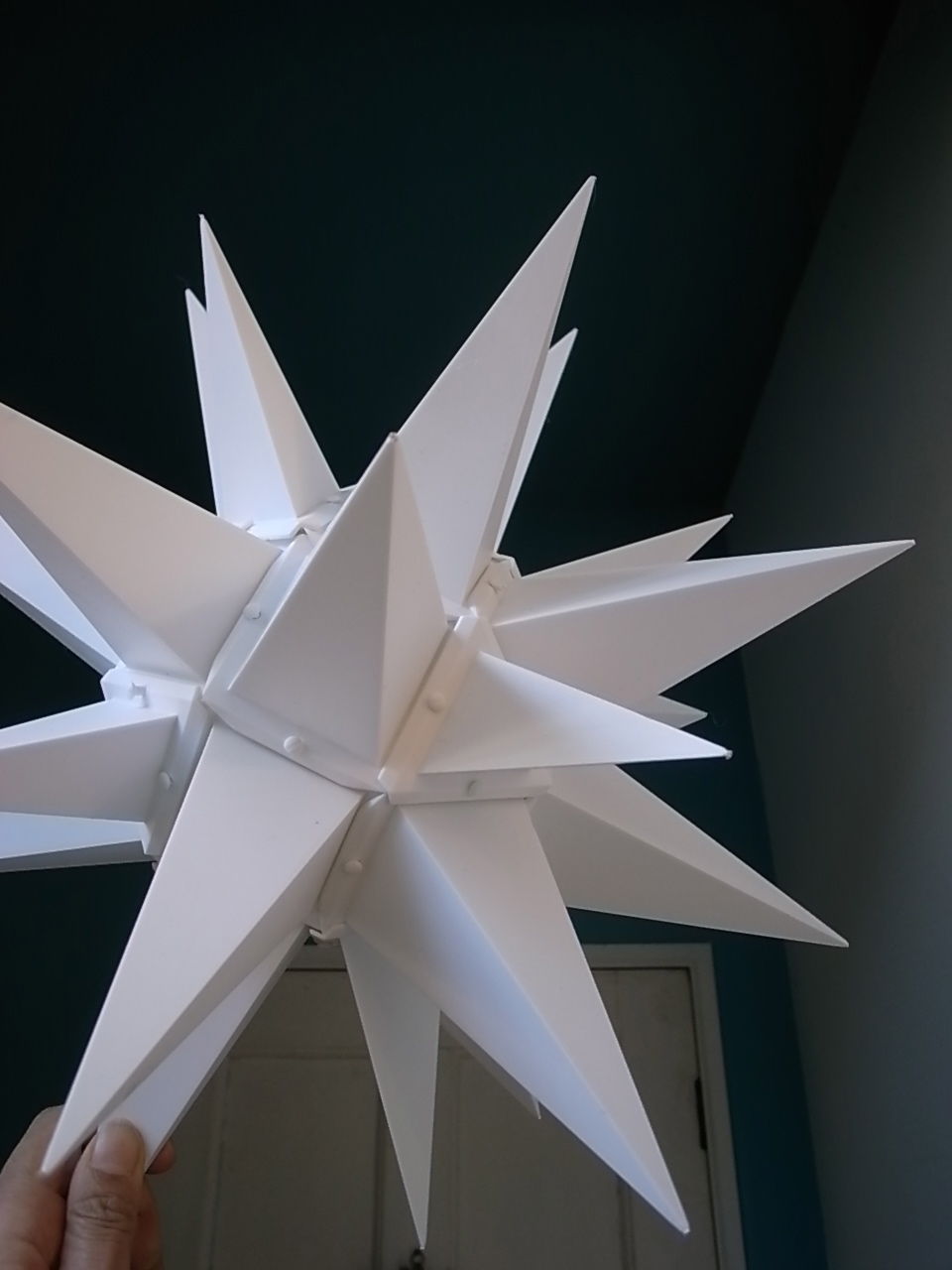 ヘルンフート Herrnhut イガイガ星の飾り、まだ、天井からぶら下げるフックがついていないので、テーブル上に置いているだけです。が、これにはわが家の男たちも大喜び!「すっごくいいねーっ!さすがドイツの工作物は精度が違う!」と、反応があって嬉しいことですが、私のことは誉めてもらえませんでした。苦労して作ったのに。