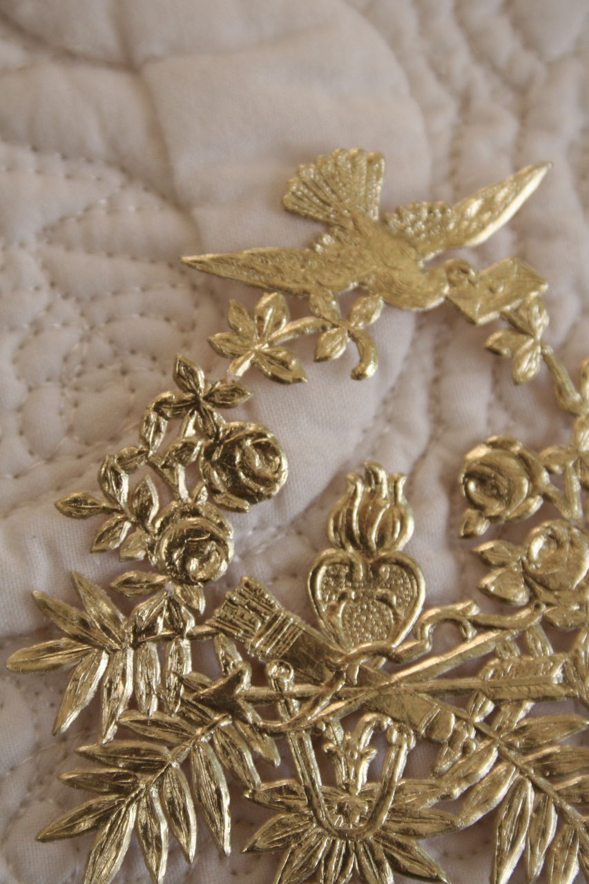 4、ボリューム感のない平たい飾りは最後に。これは表面でついていたほうがきれいに華やかになる。